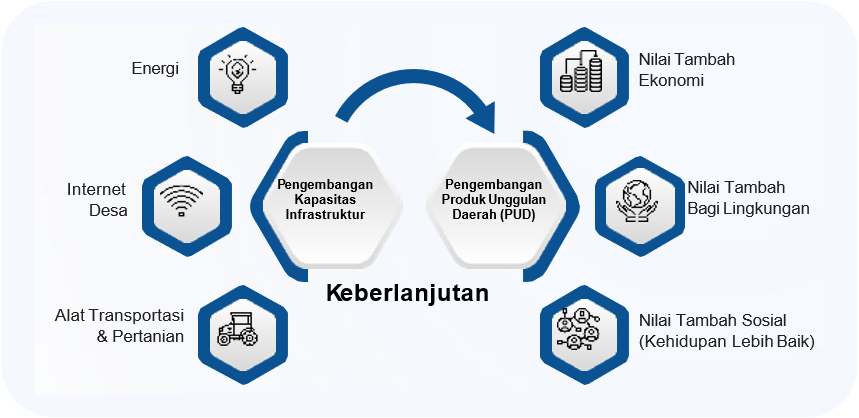 Membangun kapasitas untuk kehidupan yang berkelanjutan, menghargai budaya yang ada, dan menemukan peluang bisnis melalui pengembangan Infrastruktur pedesaan, penerapan teknologi dan Inovasi untuk pengembangan produk unggulan, membangun keterampilan/kompetensi, melalui sinergi komunitas/masyarakat, dunia usaha, akademisi dan pemerintah/pemerintah daerah. Inovasi dijalankan dengan memperhatikan kebutuhan dan keberlanjutan dalam jangka panjang, menyentuh langsung aspek kehidupan masyarakat, sehingga dapat memperkuat atau meningkatkan akumulasi modal pengetahuan, sosial dan ekonomi dalam rangka meningkatkan kesejahteraan masyarakat.